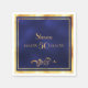 A napkin for an elegant dark blue and gold themed 50th birthday party. The blue colour is uneven like a fresco lime painted wall. Templates for a name, age, date of birth and date of the anniversary. Golden coloured letters. With a faux gold frame. With classic swirl decor. For both him and her.