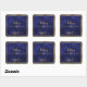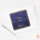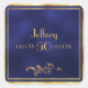 A sticker for an elegant blue and gold themed 50th birthday party. Templates for a name, age, date of birth and date of the anniversary. Golden coloured letters. Blue background colour and a faux gold frame. The blue colour is uneven, like a fresco lime painted wall. With classic swirl decor.