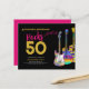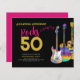 Personalised Rocks 50th birthday party pink black and gold invitations with three cool watercolor guitar designs. An electric guitar with colourful pattern and white pick guard, a multicolored semi acoustic guitar and a psychedelic classic acoustic guitar art illustration with personalised black and gold modern cool typography. This easy to use template creates the perfect invitation to celebrate fifty in rock n roll style and is ideal for a guitarist, musician and music lovers. Any guitar player will tell you that you can never have too many guitars. This cool modern musical instrument design celebrates the music energy of this wonderful musical instrument and is the perfect way to rock a fiftieth birthday celebration. Original artwork by artist Catherine Sweetman