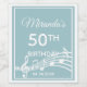 A wine or sparkling wine bottle label for an elegant teal, light blue themed 50th birthday party. Templates for a name, age 50, and date of the party. White letters. Teal background colour and a white frame and white music notes. You can change the background colour to match your theme. Click customise and then "select a background colour" on your right.