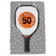 Happy 50th Birthday text on orange pickleball and paddle on polka dot grey and white pattern.