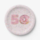 Pink icing on doughnut with colourful candy sprinkles and stars on curled paper and pink background for 50th birthday party.
