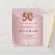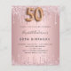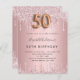 A modern, stylish and glamourous invitation for a 50th birthday party. A dusty rose, pink faux metallic looking background with faux glitter drip, paint drip look. The name is written with a modern dark grey coloured hand lettered style script. Personalise and add your party details. Number 50 is written with a balloon style font, script.