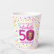 Bright colourful confetti random dots birthday 50th two photos now and then paper party cups. Bright deep pink, coral, hot pink, red, yellow and golden yellow. Add your own birthday girl's photo in the centre of the 0 in 50 on both sides, ideal for a past and present photo opportunity and customise with your own name and party congratulations words. Currently reads Happy Birthday Michelle 50 and Fabulous! Other matching items and milestone birthday years available. Original design by www.mylittleeden.com on zazzle.
