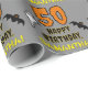 This scary and spooky Halloween birthday themed wrapping paper design features a large number "50". It also features the message "HAPPY BIRTHDAY,", and an editable name. There are also depictions of a ghost and a bat on the front. Wrapping paper like this might be used when wrapping gifts that are being given to somebody whose fiftieth birthday falls on Halloween (October 31st). [~Z0000411]