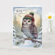 A charming owl in a winter hat perches on a snow-covered branch in a peaceful snowy forest, depicted in watercolor, for anyone's 50th birthday.