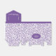 The design is a purple and white random number pattern with milestone number "50" repeated in varied sizes and angles. There is an area on the upper flap and an oval label on the front for your text.