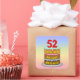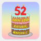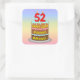 This colourful and upbeat birthday square sticker design features a cartoon-style depiction of a three-tier birthday cake having numeral-shaped candles on top showing the number “52“, along with the message “HAPPY 52ND BIRTHDAY,”, and a personalised recipient name. The background has a multi-colour pastel rainbow spectrum inspired gradient pattern. Stickers like these might be given out or used at a birthday party held in celebration of somebody’s 52nd birthday, or perhaps used when preparing gifts or invitations for such an event. [~Z0000624]