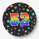 This cheerful, colourful, and fun paper plate design features a large number "52" containing a rainbow spectrum gradient inspired pattern. The background features a colourful pattern of star shapes. Fun paper plates like this might be used at a celebration being held in honour of somebody’s fifty second birthday, or a couple’s 52nd anniversary, or some other fifty second event. [~Z0000493]