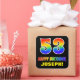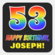 This fun, cheerful, and colourful birthday themed sticker design features a large number "53" and the message "HAPPY BIRTHDAY,", both having a rainbow spectrum gradient inspired pattern colouring, along with a bold yellow customisable name. The background is coloured black. Fun stickers like this might be used when wrapping presents being given to somebody in celebration of their 53rd birthday, or perhaps might be handed out to the attendees at a birthday celebration or party. [~Z0000480]