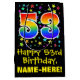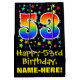 This exciting, fun, and colourful birthday-themed gift bag design features a large number "53" with a rainbow spectrum gradient style pattern, along with the message "Happy 53rd Birthday,", and a personalised recipient name. It also has a colourful background pattern featuring star shapes of various sizes. A birthday themed gift bag like this might be used when giving a gift or present in celebration of somebody’s 53rd birthday. [~Z0000510]