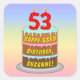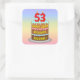 This colourful and upbeat birthday square sticker design features a cartoon-style depiction of a three-tier birthday cake having number-shaped candles on top showing the age “53“, along with the message “HAPPY 53RD BIRTHDAY,”, and a custom recipient name. The background features a multicolored pastel rainbow spectrum inspired gradient pattern. Fun stickers like these might be given out or used at a birthday party held for somebody in celebration of their 53rd birthday, or perhaps used when preparing presents or invitations for such an event. [~Z0000624]