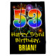 This colourful, fun, and exciting birthday-themed gift bag design features a large number "53" with a rainbow spectrum gradient style pattern, along with the message "Happy 53rd Birthday,", and a custom recipient name. It also features a colourful background pattern inspired by bursting celebratory fireworks. A gift bag like this might be used when giving a gift or present in honour of somebody’s 53rd birthday. [~Z0000509]