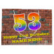 This fun and vibrant birthday themed gift bag design, inspired by graffiti, features a large number "53" with a rainbow spectrum gradient inspired pattern, along with the message "Happy 53rd Birthday,", and a customisable name. It also has a brick wall style pattern background. A colourful birthday themed giftbag like this might be a fun way to wrap a gift or present being given to somebody who is celebrating their 53rd birthday. [~Z0000522]
