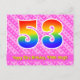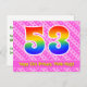 The front of this upbeat, happy, and fun birthday-themed postcard design features a large number "53" with a rainbow spectrum gradient inspired pattern, along with the message "Happy 53rd Birthday,", and a personalised recipient name. The front additionally features a cheerful light pink and dark pink heart shapes and stripes pattern. The back features a custom birthday greeting message, or could perhaps be cleared and left blank if a message is to be written by hand instead. A customisable birthday postcard like this might be a fun way to send a message celebrating somebody’s fifty third birthday. Postcards like this might also be used to invite guests to a birthday celebration being held for somebody who is turning 53 years old. [~Z0000449]