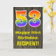 The front of this colourful yet rustic birthday greeting card design features a large number "53" with a rainbow spectrum gradient inspired pattern, along with the message "Happy 53rd Birthday,", and a customisable recipient name. The front features a background depicting a rustic faux wood grain look pattern. The inside features a customisable birthday greeting message, or could perhaps be cleared and left blank if a message is to be written by hand instead. A customisable birthday card like this might be a fun way to celebrate somebody’s fifty third birthday. [~Z0000419]
