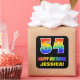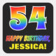 This colourful, cheerful, and fun birthday sticker design features a large number "54" and the message "HAPPY BIRTHDAY,", both coloured with a rainbow spectrum gradient inspired pattern, along with a bold yellow personalised name. The background is coloured black. Fun birthday themed stickers like this might be used when wrapping a gift or present being given to celebrate somebody’s 54th birthday, or perhaps may be given out to the attendees at a birthday celebration. [~Z0000480]