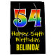 This fun, exciting, and colourful birthday themed giftbag design features a large number "54" with a rainbow spectrum gradient inspired pattern, along with the message "Happy 54th Birthday,", and an editable recipient name. The background is coloured black. A birthday themed gift bag like this might be used when giving a gift or present in celebration of somebody’s fifty fourth birthday. [~Z0000512]