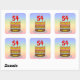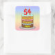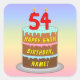 This cheerful and joyful birthday-themed square sticker design features a cartoon-style depiction of a three-tier birthday cake having numeral-shaped candles on top showing the number “54“, along with the message “HAPPY 54TH BIRTHDAY,”, and a custom recipient name. The background has a multi-colour pastel rainbow spectrum inspired gradient pattern. Upbeat birthday themed stickers like these might be used or distributed at a party for somebody who is celebrating their fifty fourth birthday, or perhaps used when preparing invitations or gifts for such an event. [~Z0000624]