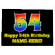 This fun and vibrant birthday themed giftbag design features a large number "54" with a rainbow spectrum gradient inspired pattern, along with the message "Happy 54th Birthday,", and a customisable name. The background is coloured black. A colourful gift bag like this might be used when giving a gift or present in honour of somebody’s fifty fourth birthday. [~Z0000521]