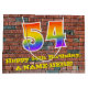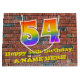 This fun and vibrant birthday giftbag design, inspired by street art, features a large number "54" having a rainbow spectrum gradient inspired pattern. It also features the message "Happy 54th Birthday,", and a personalised name. The background features a brick wall inspired pattern. A colourful gift bag like this might be used when giving a gift or present in honour of somebody’s 54th birthday. [~Z0000522]