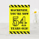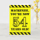 The front of this attention-grabbing and fun birthday themed greeting card design features a custom name and the message "YOU’RE NOW 54 YEARS OLD!" in black stencil look text on a yellow colored background. There is also an eye-catching yellow and black striped pattern at the top and bottom edges of the front. The inside features a personalized birthday greeting message, or could perhaps be cleared and left blank if a message is to be written by hand instead. A custom birthday card like this might be a fun way to send birthday wishes to somebody who is celebrating their fifty fourth birthday. [~Z0000413]