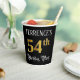 This fancy and elegant birthday paper cup design features a customisable name and the message “54th Birthday Party”. The large number “54th” has a faux/imitation gold-inspired colouring pattern, the words “Birthday Party” are in ornate script-style text, and the background is coloured black by default (although it can be customised). Opulent, ornate paper cups like this might be useful to have at a birthday party/celebration being held to honour somebody’s 54th birthday. [~Z0000567]