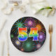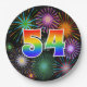 This fun, colourful, and cheerful paper plate design features a large number "54" containing a rainbow spectrum gradient inspired pattern. It also features a exciting and vibrant bursting celebratory fireworks inspired pattern. It has a black coloured background. Fun paper plates like this might be used at somebody’s 54th birthday celebration, a 54th anniversary party, or some other fifty fourth event. [~Z0000490]