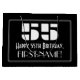 This vintage look Roaring Twenties style inspired birthday-themed gift bag design features a large art deco look inspired number "55", the message "Happy 55th Birthday,", a custom name, and a border pattern consisting of thin lines. It features a black-colored background. A gift bag like this might be used when wrapping gifts being given to somebody in celebration of their fifty fifth birthday. [~Z0000495]