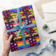 This happy and fun birthday-themed wrapping paper design features a large number “55” with a rainbow spectrum gradient inspired pattern, along with the message “Happy 55th Birthday,”, and a customisable name. The background features a pattern of heart shapes with colours like pink, red, and purple. Wrapping paper like this might be used when wrapping gifts being given to somebody in celebration of their fifty fifth birthday. [~Z0000549]