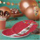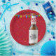 Brown beer bottle with party bunting and colourful confetti on red background for 55th birthday.