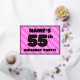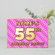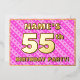 The front of this joyful fifty-fifth birthday celebration foil invitation card design features a customisable name, a large number “55th”, the message “BIRTHDAY PARTY!”, and a border. The background of the front has an upbeat dark pink and light pink striped pattern containing heart shapes. The back features personalised details about the event, such as the date, time, venue/location, and any other important information. Customised invitations like these might be a fun way to invite attendees to a birthday gathering/party being held to honour somebody’s 55th birthday. [~Z0000603]