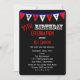 This fun 55th birthday party invitation features a bunting theme with white and red flags with H A P P Y inside on a black backdrop. A fun typography is utilised for the birthday details to make a modern invitation to a 55th birthday celebration for men. Copyright henishouseofpaper
