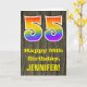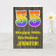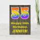 The front of this colourful yet rustic birthday themed greeting card design features a large number "55" with a rainbow spectrum gradient inspired pattern, along with the message "Happy 55th Birthday,", and an editable recipient name. The background of the front of the card features a rustic faux wood grain look pattern. The inside features a customisable birthday greeting message, or could perhaps be cleared and left blank if a message is to be written by hand instead. A birthday card like this might be a fun way to send birthday wishes to somebody who is celebrating their fifty fifth birthday. [~Z0000419]