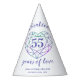 Alexandrite 55 years wedding anniversary party hats. The design features purple blue script typography on white with your names and the words of celebration 55 years of love in script style font and a line art heart purple green alexandrite style graphic gemstone. Personalise with your names and anniversary wedding dates. The 55th wedding anniversary is associated with the gemstone Alexandrite and the heart symbolises love. Other matching amethyst wedding anniversary items available. Line art and design by www.mylittleeden.com on zazzle.