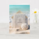 A beautifully embossed wedding invitation card rests inside an envelope on the sand near the ocean's edge, accompanied by a sand dollar for a 55th wedding anniversary.