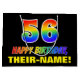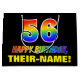 This cheerful, fun, and colourful birthday gift bag design features a large number "56" and the message "HAPPY BIRTHDAY,", both having a rainbow spectrum gradient inspired pattern colouring, along with a bold yellow personalised recipient name. The background is coloured black. A fun gift bag like this might be used when wrapping presents being given to somebody in celebration of their 56th birthday. [~Z0000477]