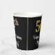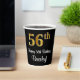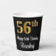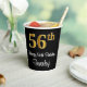 This stylish, sophisticated, and luxurious birthday themed paper cup design features a large ordinal number “56th” having a faux/imitation gold-inspired look, in addition to the birthday greeting message “Happy 56th Birthday,” and a custom name in a script-style font. The background is coloured black. Paper cups like this might be use at a party for somebody who is celebrating their fifty sixth birthday. [~Z0000538]