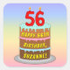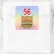 This joyful and colourful birthday-themed square sticker design features a cartoon-style depiction of a three-tier birthday cake having numeral-shaped candles on top showing the number “56“, along with the message “HAPPY 56TH BIRTHDAY,”, and a personalised recipient name. The background features a multicolored pastel rainbow spectrum inspired gradient pattern. Stickers like these might be distributed or used at a party held for somebody who is celebrating their 56th birthday, or perhaps used when preparing invitations or presents for such an event. [~Z0000624]