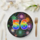This cheerful, fun, and colourful paper plate design features a large number "56" coloured with a rainbow spectrum gradient inspired pattern. It also features a exciting and vibrant bursting celebratory fireworks inspired pattern. The background is coloured black. Fun paper plates like this might be used at a celebration being held to honour somebody’s 56th birthday, a 56th anniversary, or some other 56th event. [~Z0000490]