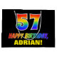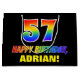 This cheerful, fun, and colourful birthday themed gift bag design features a large number "57" and the message "HAPPY BIRTHDAY,", both having a rainbow spectrum gradient inspired pattern colouring, along with a bold yellow custom recipient name. The background is coloured black. A fun birthday themed gift bag like this may be used to wrap a gift or present being given to celebrate somebody’s 57th birthday. [~Z0000477]