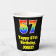 This colourful and fun birthday-themed paper cup design features a large number “57” with a rainbow spectrum gradient inspired pattern, along with the message “Happy 57th Birthday,”, and an editable name. The background is coloured black. Colourful, vibrant paper cups like this might be fun to have at a birthday party being held to celebrate somebody’s 57th birthday. [~Z0000537]