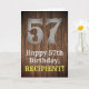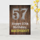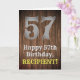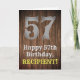 This country look and western look birthday themed greeting card design features a large rustic look number "57", the message "Happy 57th Birthday,", an editable name, and a faux/imitation wood grain inspired look pattern background. The inside has a customised birthday greeting message, or could perhaps be cleared and left blank if a message is to be written by hand instead. A customisable birthday greeting card like this might be sent to celebrate somebody’s fifty-seventh birthday. [~Z0000469]
