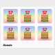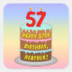 This fun and joyful birthday-themed square sticker design features a cartoon-style depiction of a three-tier birthday cake having number-shaped candles on top showing the age “57“, along with the message “HAPPY 57TH BIRTHDAY,”, and a personalised recipient name. The background features a multicolored pastel rainbow spectrum inspired gradient pattern. Stickers like these might be distributed or used at a birthday party held for somebody who is celebrating their fifty seventh birthday, or perhaps used when preparing gifts or invitations for such an event. [~Z0000624]