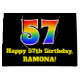 This vibrant and fun birthday-themed gift bag design features a large number "57" having a rainbow spectrum gradient inspired pattern. It also features the message "Happy 57th Birthday,", and a custom name. It also has a black-coloured background. A gift-bag like this might be used when wrapping gifts being given to somebody in celebration of their 57th birthday. [~Z0000521]