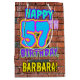 The front of this fun birthday-themed gift bag design features the message “HAPPY 57TH BIRTHDAY,” having a vibrant, colourful, urban street art and graffiti inspired look, along with an editable recipient name. The background features a pattern inspired by the look of a brick wall. A colourful birthday themed gift bag like this might be a fun way to wrap a gift or present being given to somebody who is celebrating their fifty seventh birthday. [~Z0000536]