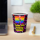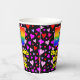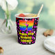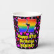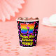 This happy and joyful birthday-themed paper cup design features a large number “57” with a rainbow spectrum gradient inspired pattern, along with the message “Happy 57th Birthday,”, and an editable name. The background features a pattern of heart shapes with colors like red, purple, and pink. Cheerful, joyful paper cups like this might be fun to have at a birthday party being held in celebration of somebody’s 57th birthday. [~Z0000548]