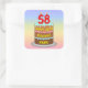 This joyful and fun birthday themed square sticker design features a cartoon-style depiction of a three-tier birthday cake having number-shaped candles on top showing the age “58“, along with the message “HAPPY 58TH BIRTHDAY,”, and a custom recipient name. The background features a multicolored pastel rainbow spectrum inspired gradient pattern. Stickers like these might be distributed or used at a party held in celebration of somebody’s 58th birthday, or perhaps used when wrapping gifts or preparing invitations for such an event. [~Z0000624]