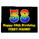 This colourful and fun birthday gift bag design features a large number "58" having a rainbow spectrum gradient inspired pattern. It also features the message "Happy 58th Birthday,", and an editable name. It also has a black-coloured background. A giftbag like this might be used when wrapping gifts being given to somebody in celebration of their 58th birthday. [~Z0000521]
