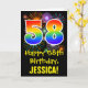 The front of this exciting, fun, and colourful birthday-themed greeting card design features a large number "58" with a rainbow spectrum gradient inspired pattern, along with the message "Happy 58th Birthday,", and an editable recipient name. The front additionally features a colourful background pattern inspired by the appearance of bursting celebratory fireworks. The inside features a personalised birthday greeting message, or could perhaps be cleared and left blank if a message is to be written by hand instead. A customisable birthday card like this might be a fun way to send a message in celebration of somebody’s fifty eighth birthday. [~Z0000442]